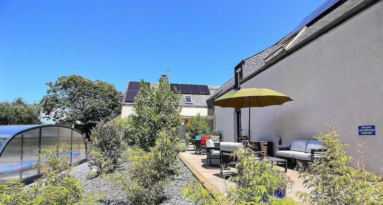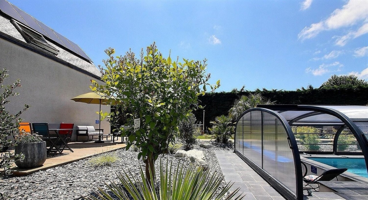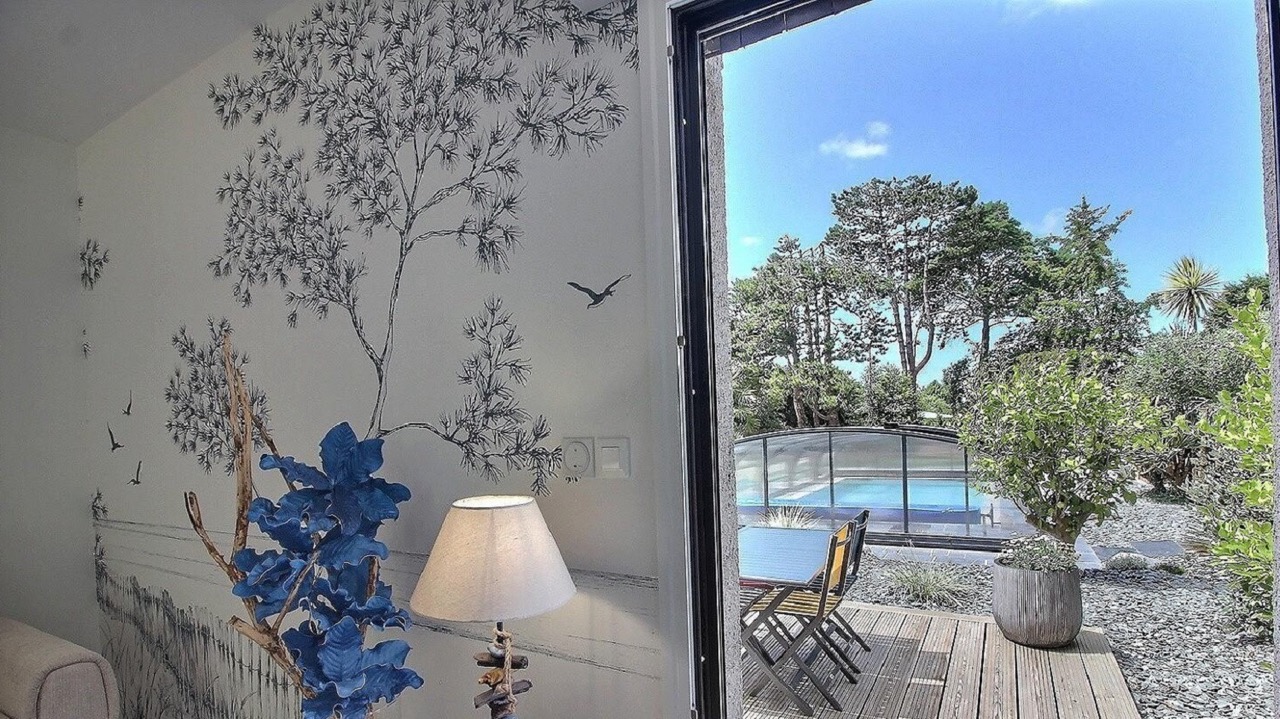 Joli appartement ambiance marine en rez-de-jardin dans maison d'architecte des années 80 proche de Paimpol avec accès direct de plain pied sur piscine couverte et chauffée du printemps jusqu'à la Toussaint dans un parc de 4000 m2 entièrement clos pour accueillir vos animaux en sécurité, situé dans le charmant petit village de Pléhédel à 7 km de la mer (plage de Brehec sur la commune de Plouha).