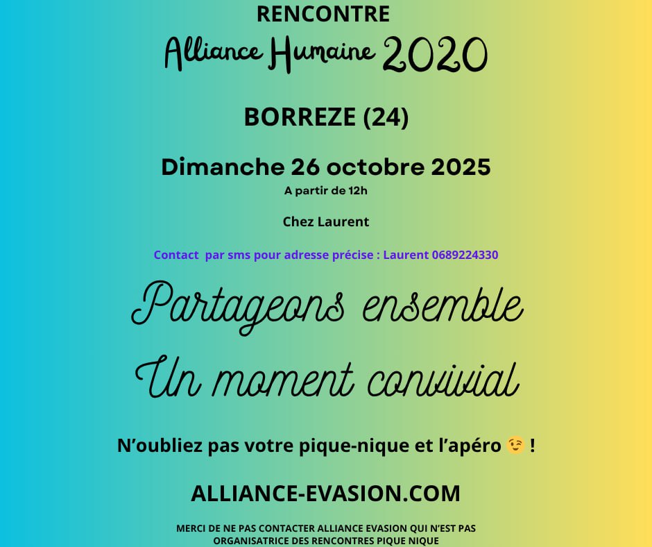 La rencontre de l'Alliance Humaine 2020 en Dordogne aura lieu le dimanche 26 octobre 2025 à partir de 12h00 à BORRÈZE (24).
