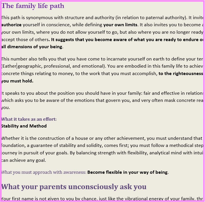 Un thème complet incluant des aspects numérologiques, cabalistiques, psycho-généalogiques, angiologiques, tarologiques sur votre personnalité, ce que vous êtes venu faire sur terre durant votre incarnation, votre chemin de vie, vos forces et vos faiblesses, vos cycles et vos opportunités, votre âme et vos différents masques, votre relation à vous-même et aux autres…