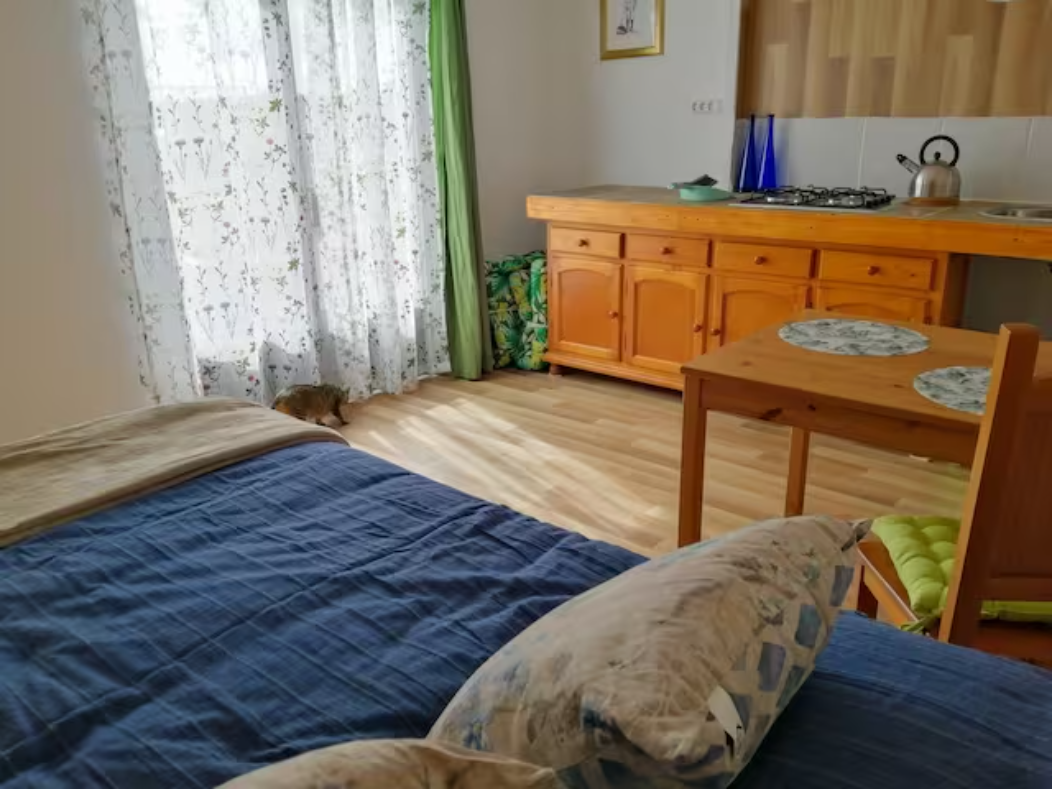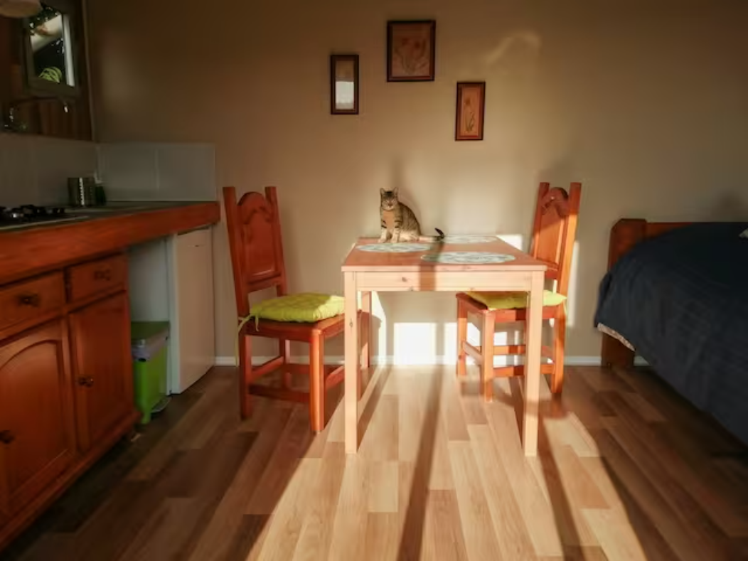 Il a une cuisine faite avec des meubles et des carreaux récupérés. Il y a un réfrigérateur et une plaque de cuisson au gaz. À côté de la cuisine, il y a une table avec deux chaises où vous pouvez manger, dessiner, travailler, etc.