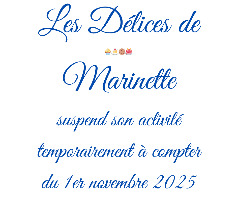 Vous pouvez me joindre par mail lesdelicesdemarinette6783@gmail.com ou par sms 0615204833 pour la première fois et pour tout devis de gâteaux et/ou biscuits spécifiques.